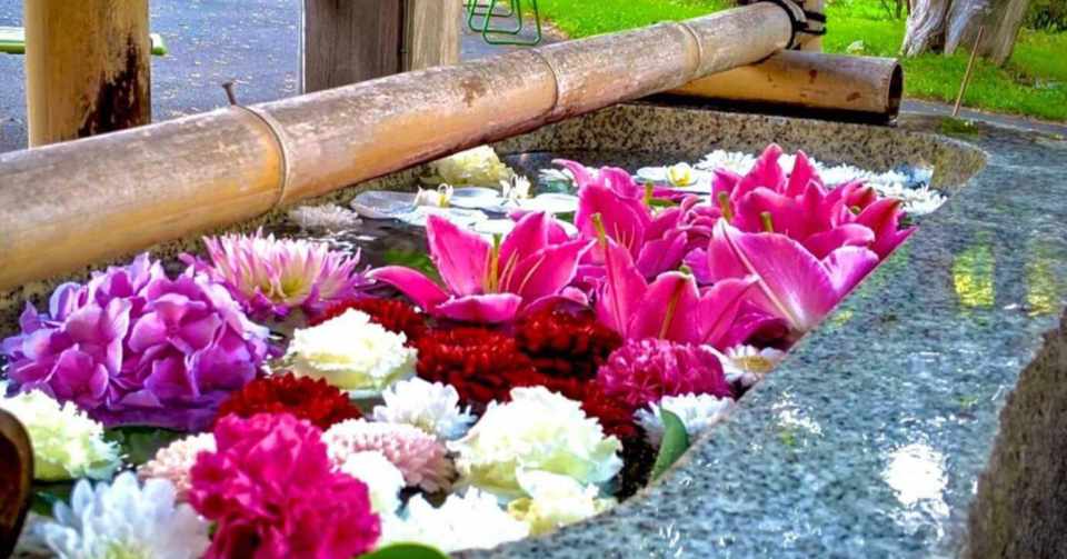 9 1 22 札幌 近郊の神社で 花詣 花手水 開催 手水鉢にお花が浮かび心を癒す お詣りして平穏な日常を祈りたい 花手水 ポロノオト