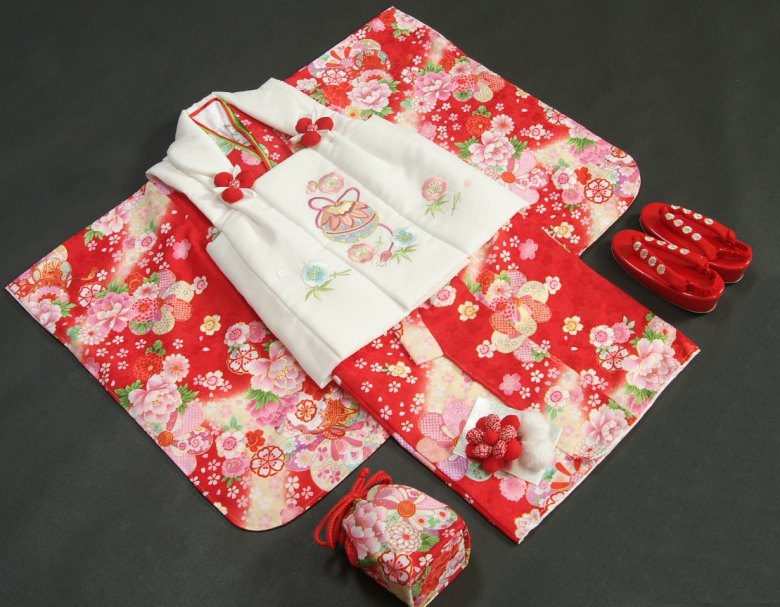 楽天市場 七五三 着物 3歳 女の子 被布セット 京都花ひめ 赤地総疋田着物 被布白 まり刺繍使い 足袋付き11点フルセット お宮参りと七五三のkyoubi 被布 疋田 京都 花