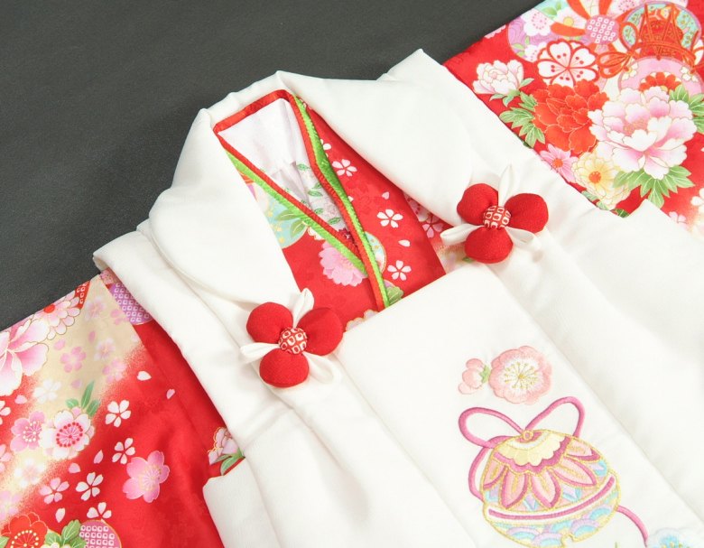 二段重ね衿 3歳女の子被布セット 3歳女の子被布セット 京都花ひめ 着物 光琳椿 七五三 着物 赤地着物 刺繍半衿に足袋付きフルセット 被布白 Inspire Qa